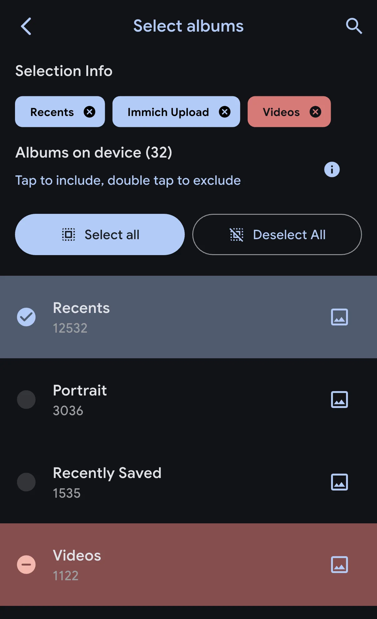 You can select which albums on your mobile device to back up to the server. You can also exclude specific albums (by double-tapping on them) from being backed up. This is useful for iOS users since assets can belong to multiple albums. For example, you may want to back up all assets except those in the "Videos" album.